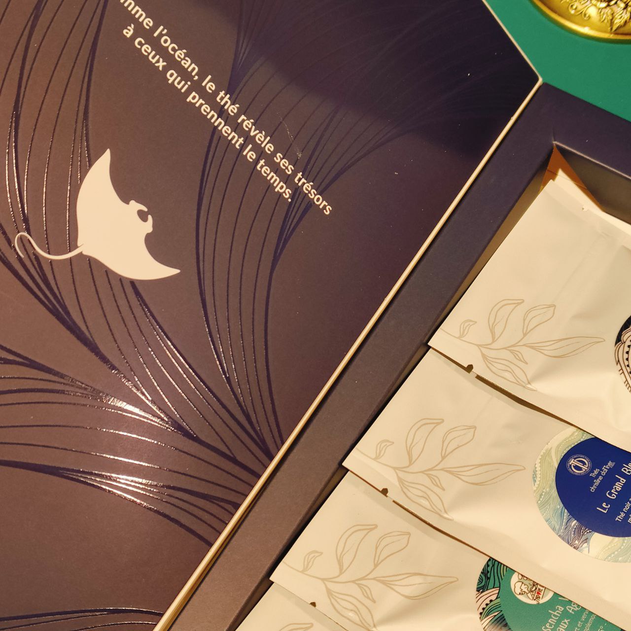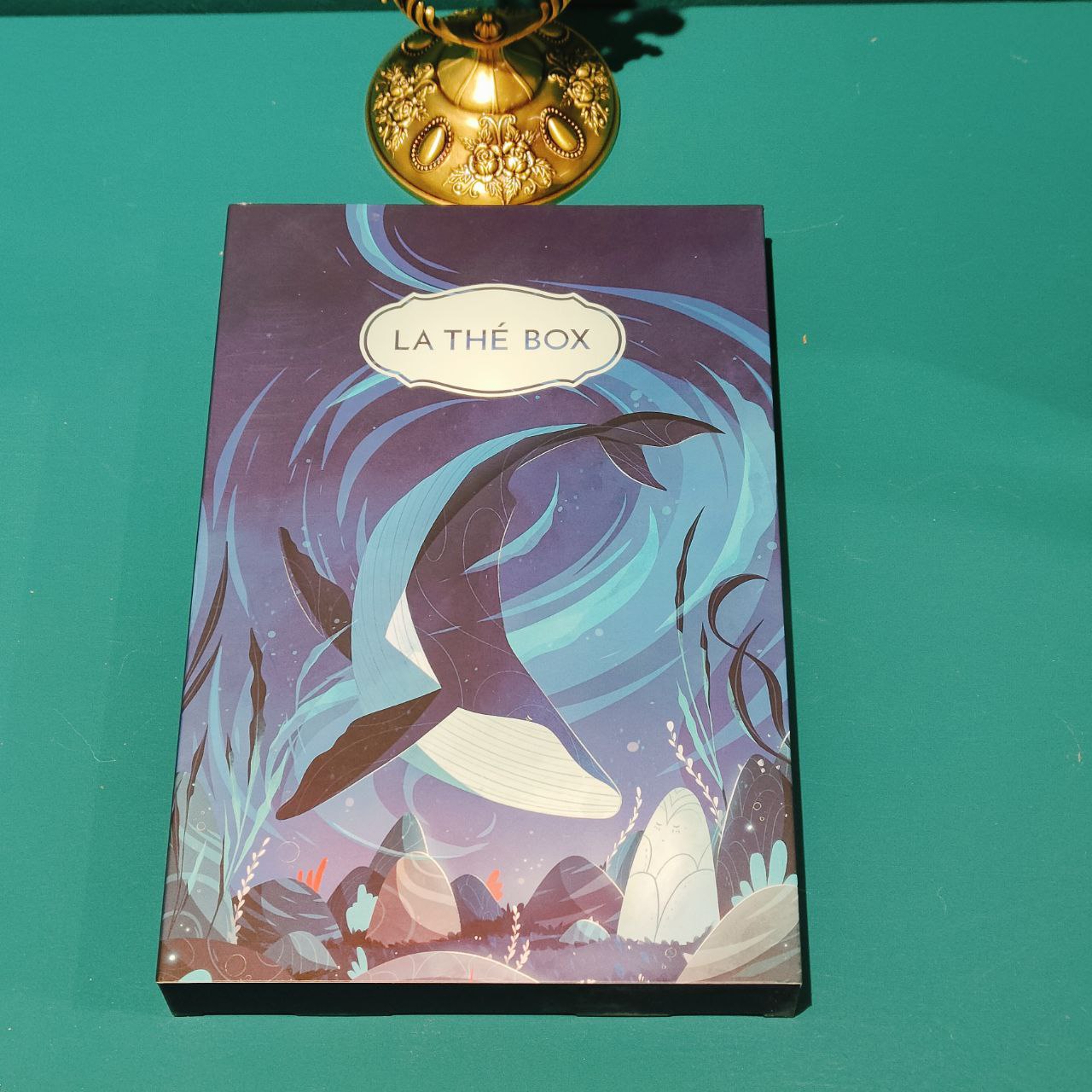 Esta caja de infusiones para regalar está inspirada en el fondo del mar, en sus colores profundos y en la calma que transmiten las grandes criaturas marinas deslizándose en silencio. La ilustración, en tonos azules, evoca un paisaje submarino donde el tiempo parece ir más despacio.