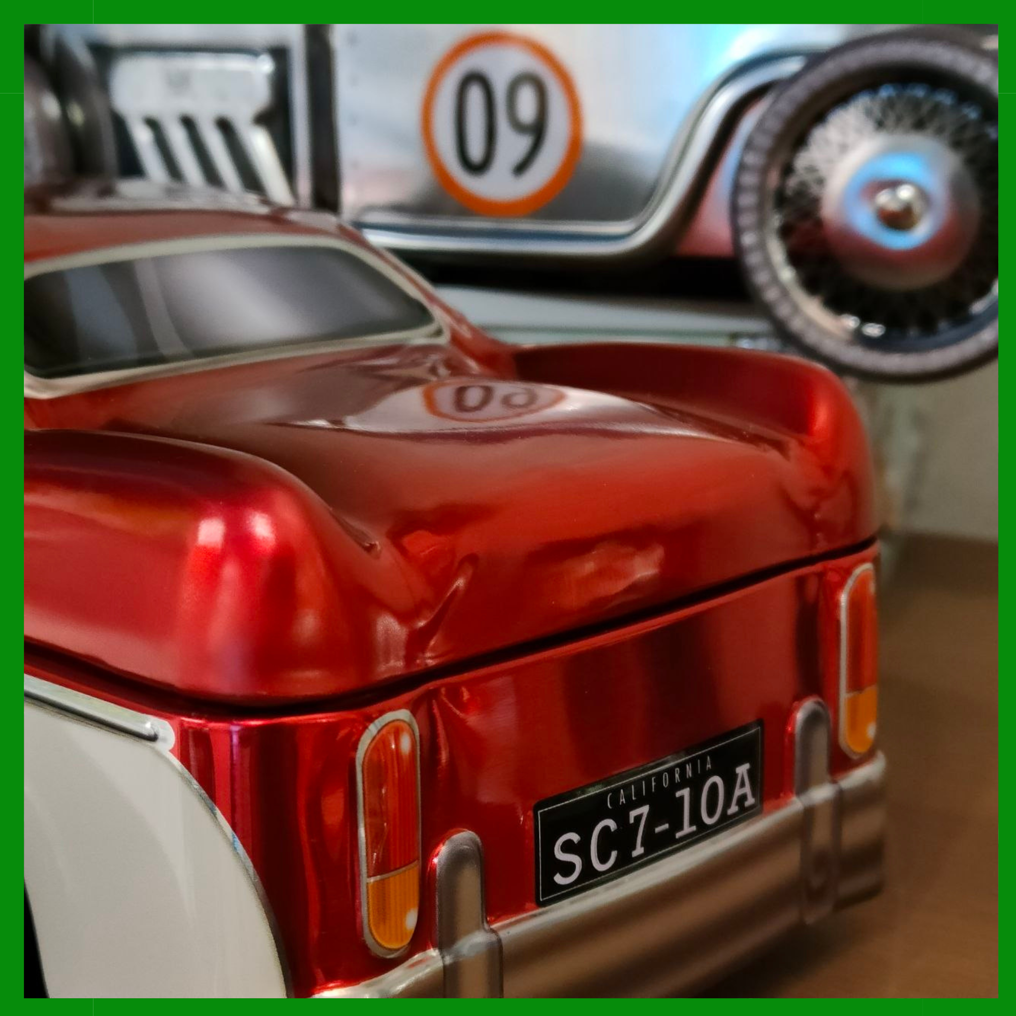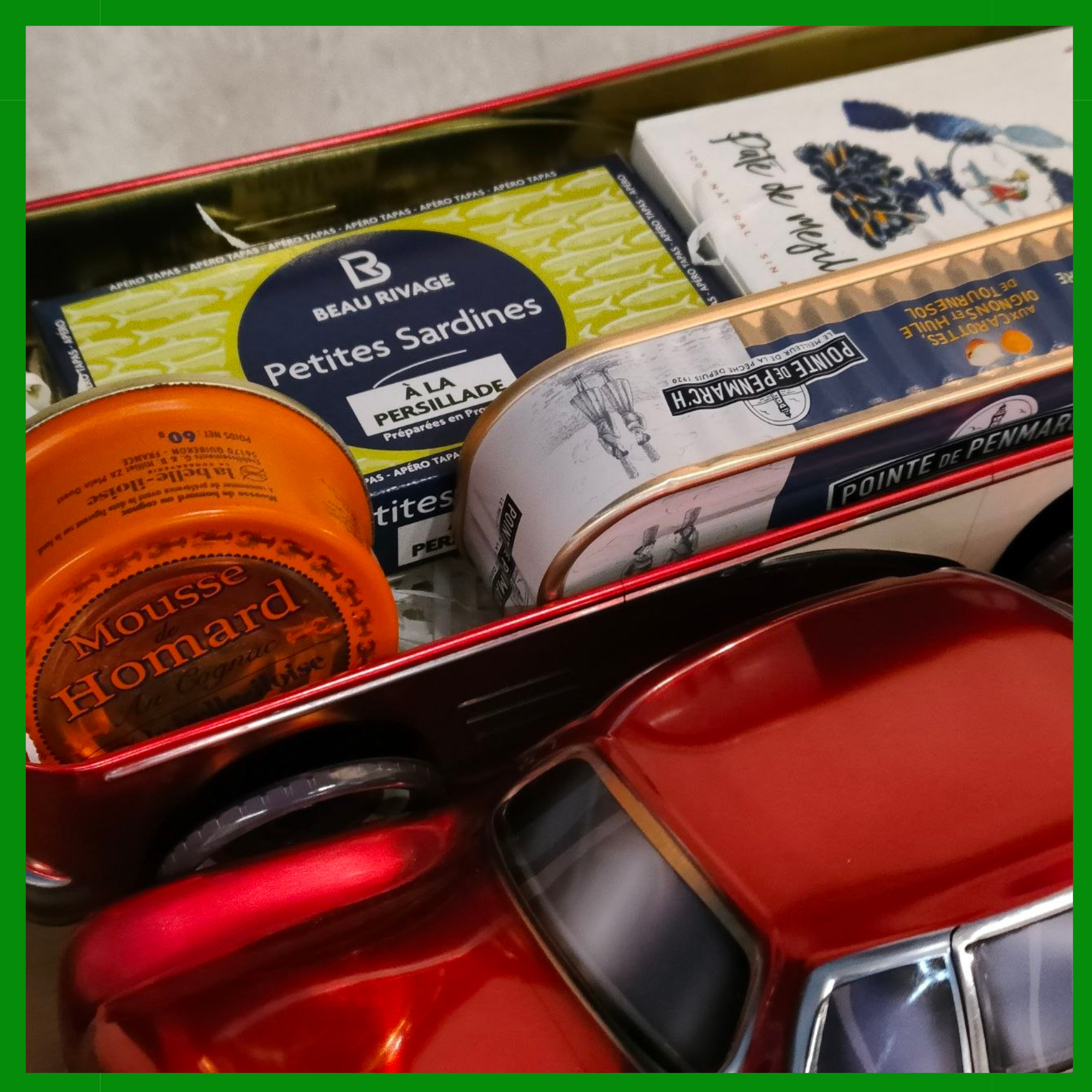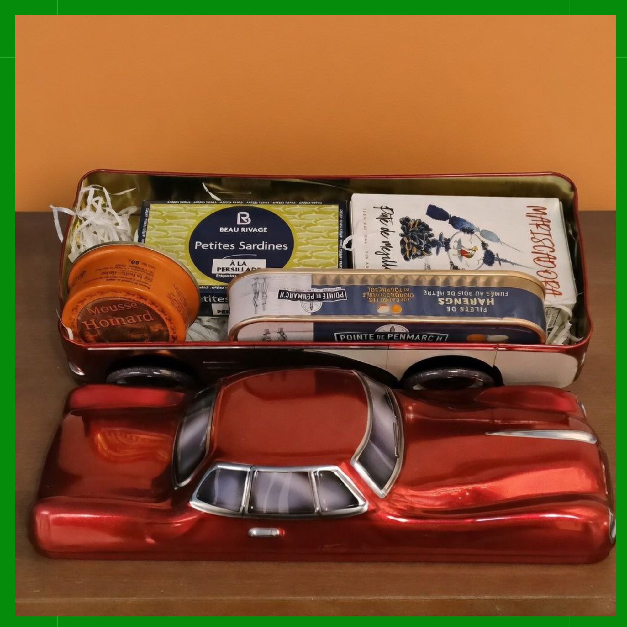 Regalo original para el Día del Padre presentado en una caja metálica en forma de coche clásico con una selección de conservas gourmet perfectas para un aperitivo especial.