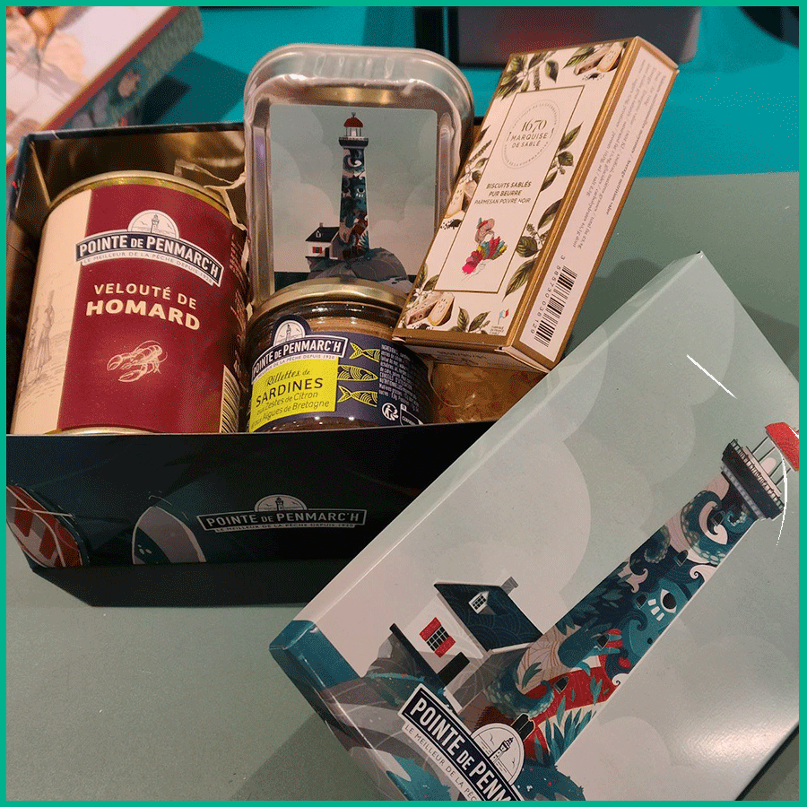 Un regalo gourmet con caja metálica ilustrada.