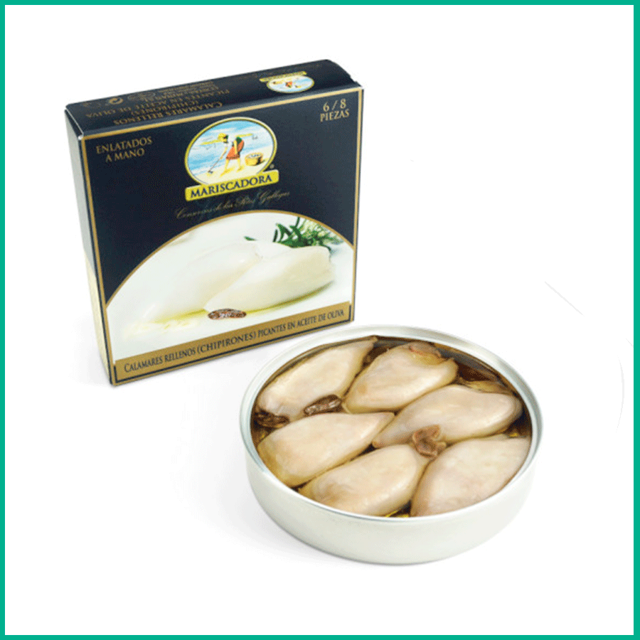 Calamares Rellenos (Chipirones) en aceite de oliva con ajo y guindilla. Un bocado Gourmet con la tradición gallega por bandera.