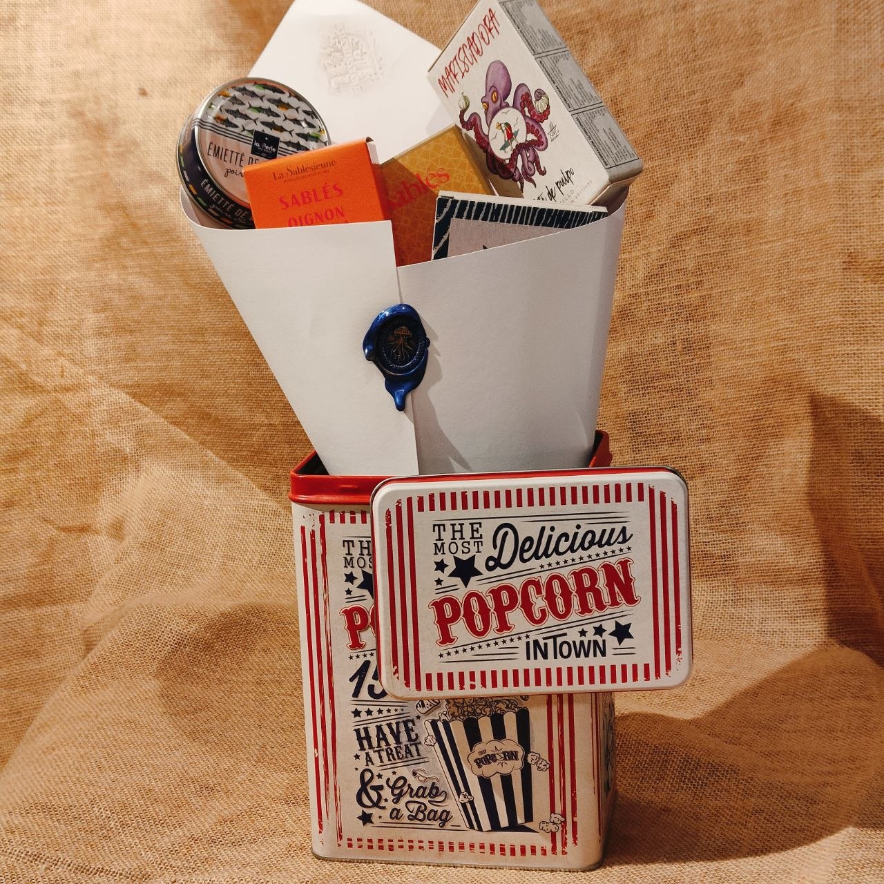Incluye caja metálica retro estilo palomitas y selección de productos gourmet.