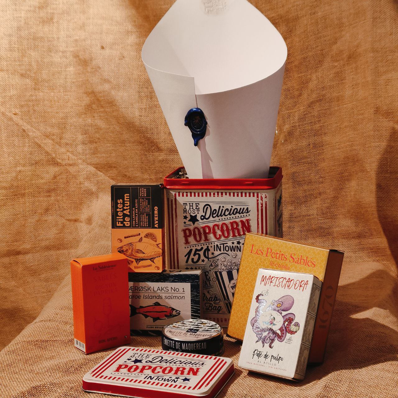 Incluye una cuidada selección de conservas y galletas gourmet, presentadas en una caja metálica retro estilo palomitas, que convierte el pack en un regalo visualmente especial y reutilizable.